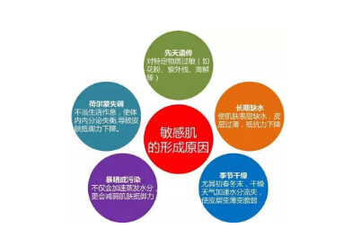 3、壓力性敏感肌膚:表現:季節交替及生理期前,化妝保養品就會變得不適用,只要睡眠不足或壓力大,肌膚就會變得干巴巴。原因:在于各種外來刺激或荷爾蒙失調,所引起的內分泌紊亂。